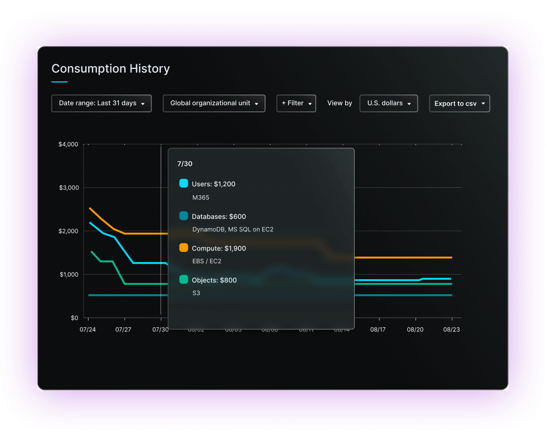 Clumio finds unnecessary snapshots, versions, and replicas, and optimizes backups across workloads, helping customers save over 30% on their backup costs on average.