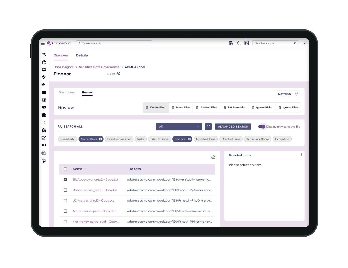 Identify and classify sensitive files across multiple data sources, on-prem or in the cloud, and apply retention, archive, or deletion policies.